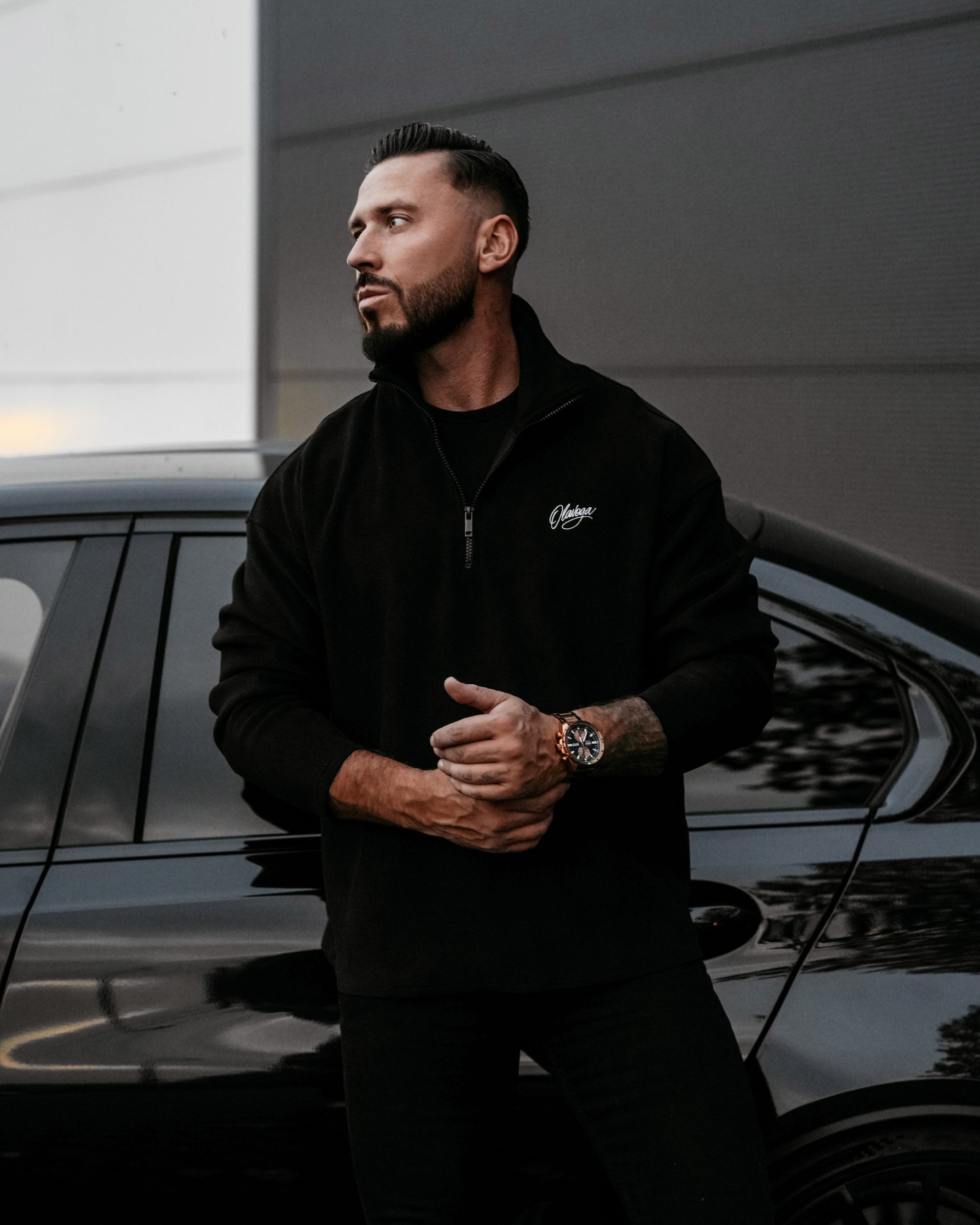 Polarowa, casualowa bluza męska. Wykonana z miękkiego, przyjemnego w dotyku polaru o gęstym splocie. Model o prostym, lekko oversize’owym kroju z wysokim kołnierzem i krótkim zamkiem pod szyją. Z przodu haft z logo marki OLAVOGA.