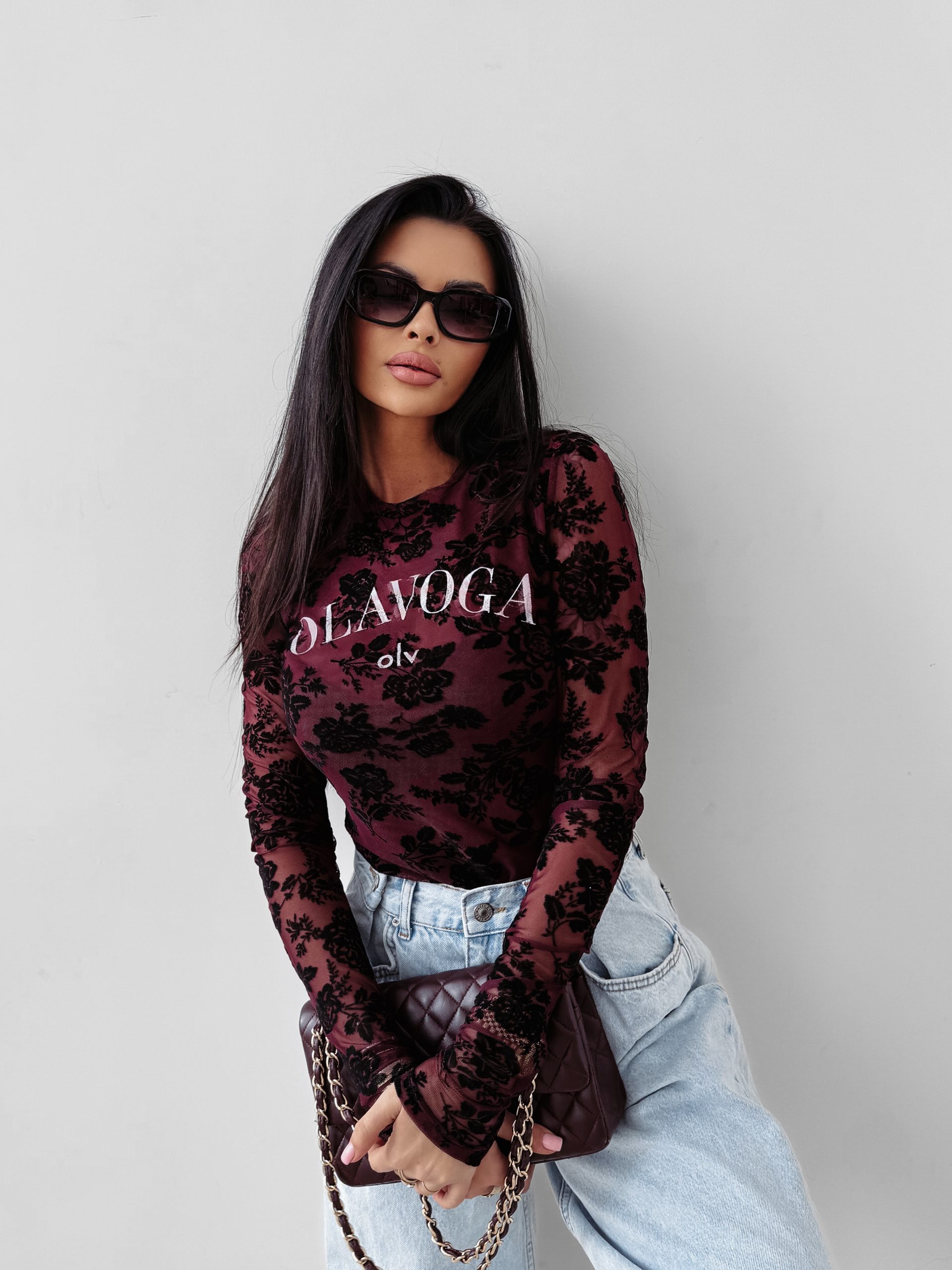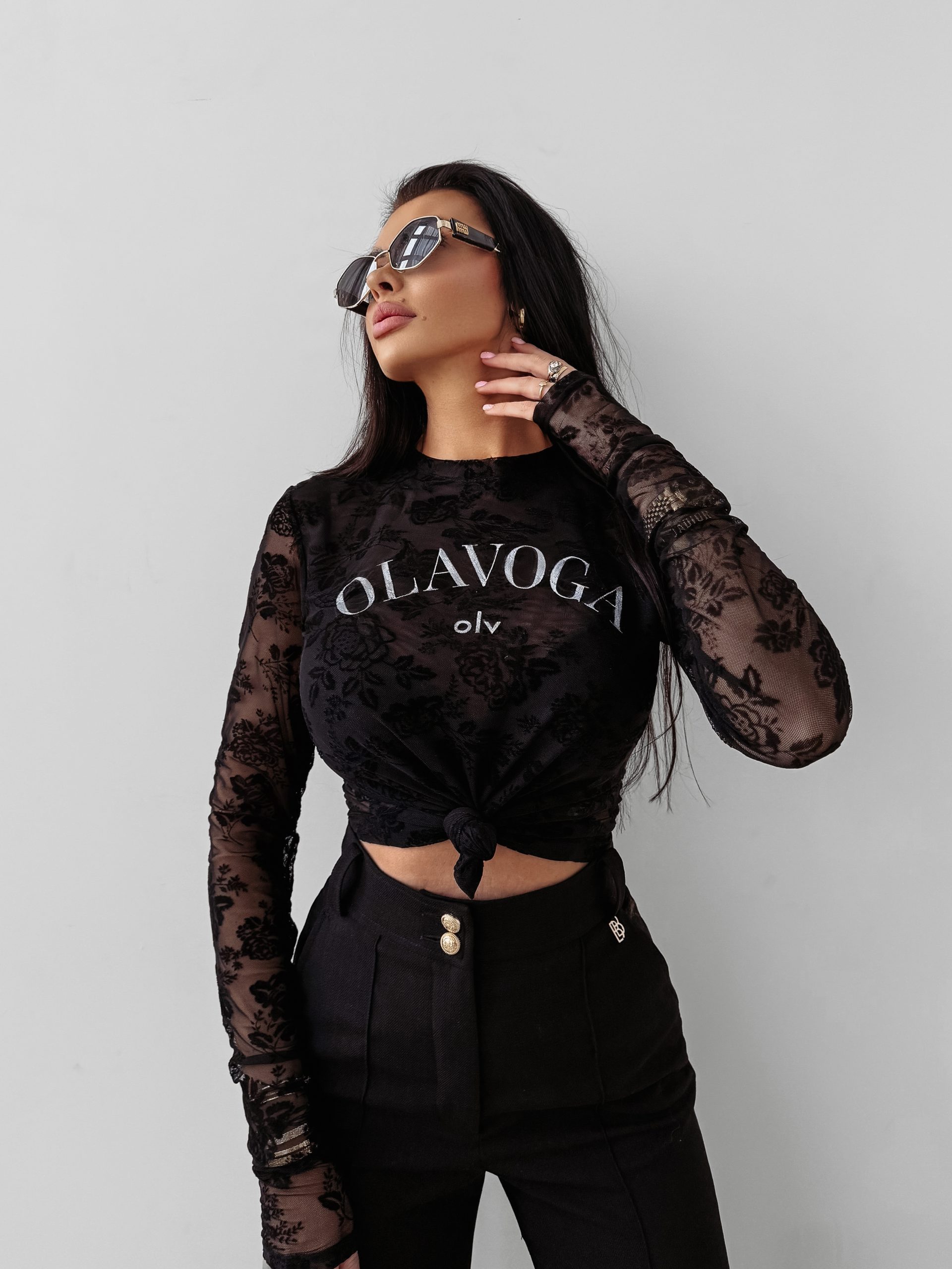 Przylegająca, transparentna bluzka wykonana z delikatnej koronki o kwiatowym wzorze. Na przodzie znajduje się charakterystyczne, kontrastowe logo marki OLAVOGA oraz subtelne oznaczenie OLV.
