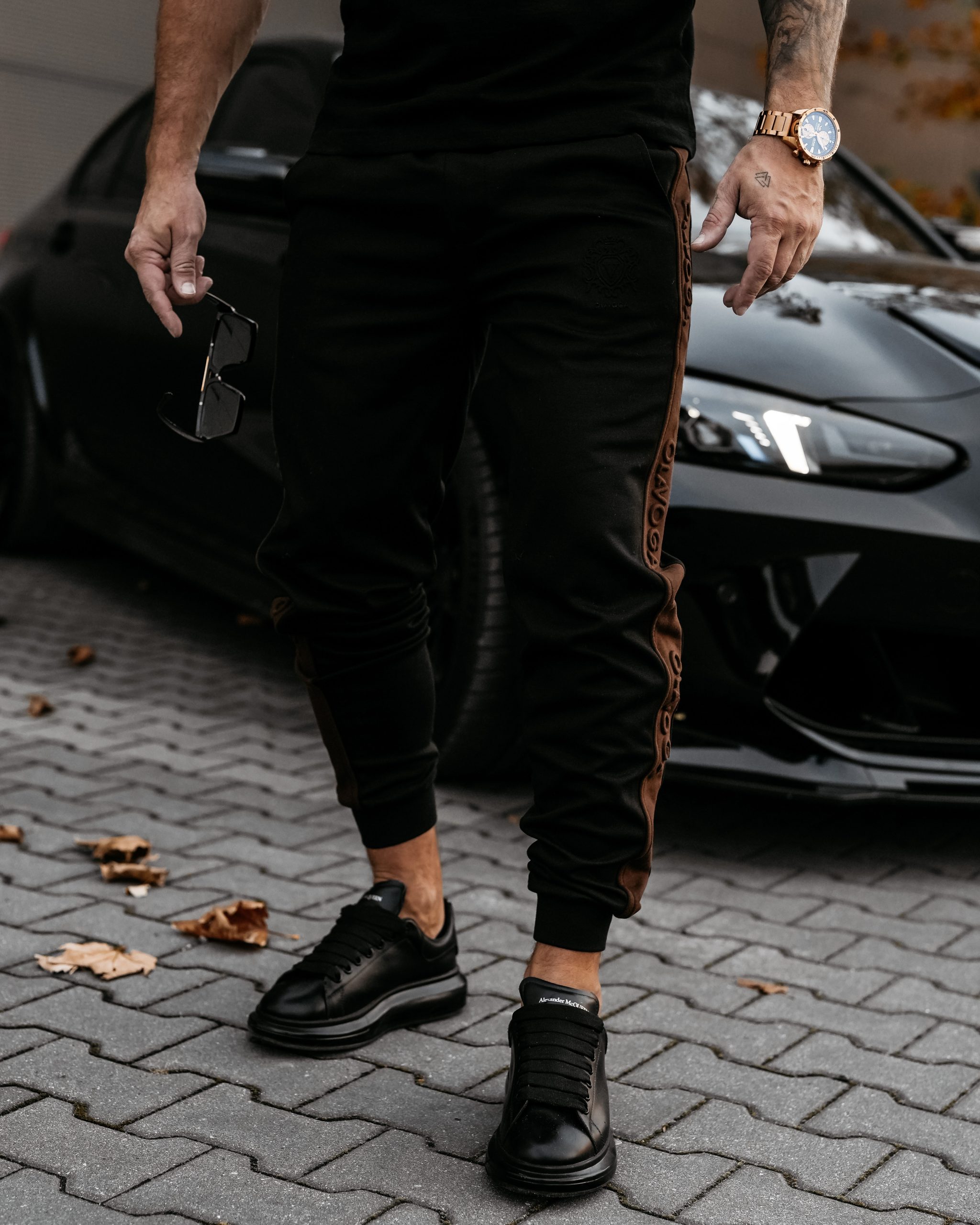 Sportowe spodnie z wysokim stanem. Wykonane z przyjemnej w dotyku, elastycznej dzianiny o wysokiej gramaturze. Model o zwężanym kroju z elastyczną gumą w pasie i troczkami regulacyjnymi zakończonymi metalowymi końcówkami. Po bokach ozdobne lampasy w kontrastowym kolorze z tłoczonym logo OLAVOGA, a z przodu haftowane logo marki. Z tyłu praktyczna kieszeń ze złotą logowaną blaszką.